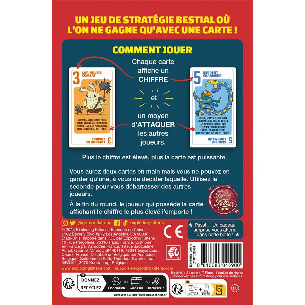 Vous avez toujours une carte en main. A votre tour piochez une nouvelle carte. Choisissez celle que vous gardez et jouez l’autre en appliquant son effet.