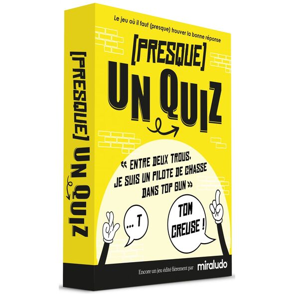Presque un Quiz est un jeu d’ambiance qui repose sur la rapidité d’esprit, la culture générale mais surtout... l’imagination. Il est idéal pour animer vos soirées entre amis ou en famille, surtout en grand groupe. Accessible, dynamique et plein d’humour, il séduira autant les amateurs de quiz que ceux qui recherchent un jeu d’ambiance original et décalé.