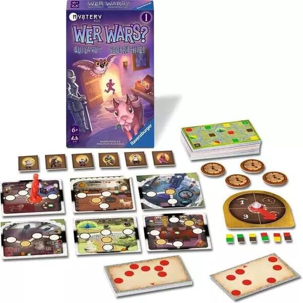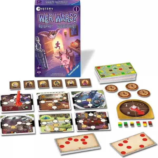 Dans le jeu coopératif Ravensburger « Qui l'a fait ? Mystères au château », les enfants tentent de découvrir qui a volé l'anneau magique. Ils interrogent les animaux du château pour les aider. Une fois les énigmes résolues, les animaux leur donnent des indices sur les innocents suspects. Les enfants parviendront-ils à démasquer le voleur à temps ?