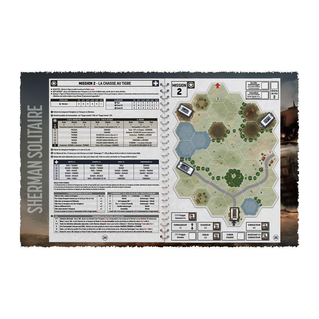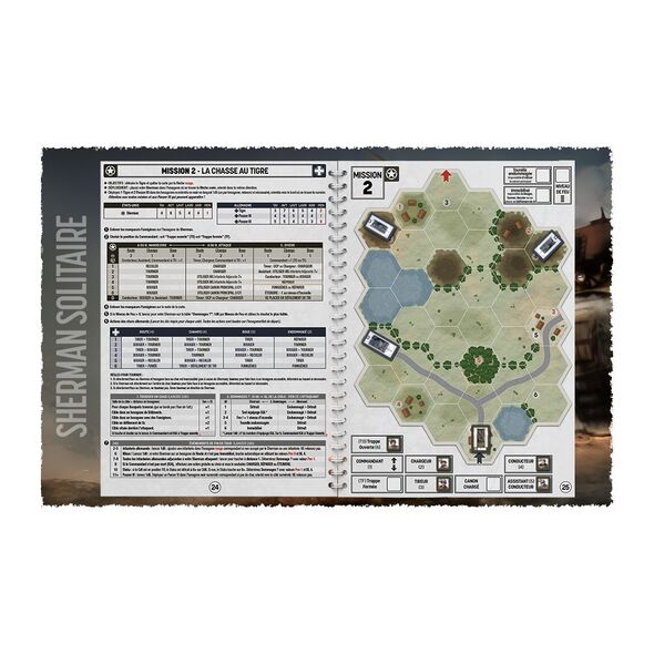 Sherman Solitaire vous place aux commandes de votre char Sherman et de son équipage quelque part en France pendant la Seconde Guerre mondiale. Il vous propose un livre-jeu de 50 pages comprenant 13 missions variées pour relever les défis qui vont se mettre en travers de votre route. Planche de pions incluse pour vous lancer immédiatement dans la bataille ! (dés à 6 faces standard non fournis).