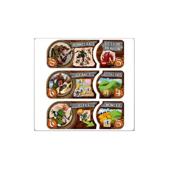 Au début de la partie, 6 combinaisons Peuple - Pouvoir Spécial sont formées et placées en colonne à côté du plateau de jeu. À son tour, chaque joueur choisit une de ces combinaisons. La 1re combinaison (en haut de la colonne) est gratuite, mais la 2e coûte un jeton de victoire, la 3e deux jetons de victoire, etc. Ainsi, la combinaison de Sorciers Volants ci-contre coûtera deux jetons de victoire. Les jetons dépensés sont placés sur les combinaisons précédentes. Lorsqu'un joueur choisira une des deux premières combinaisons par la suite, il empochera le jeton placé dessus !