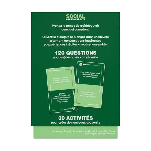 Piochez une carte et laissez les petits-enfants lire la question destinée aux grands-parents pour lancer la conversation. Ensuite, passez la carte aux grands-parents et laissez-les poser la question destinée aux petits-enfants.Informations supplémentaires