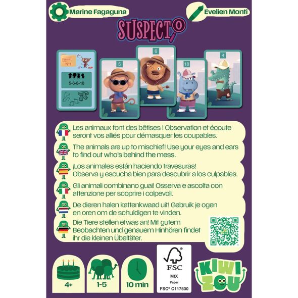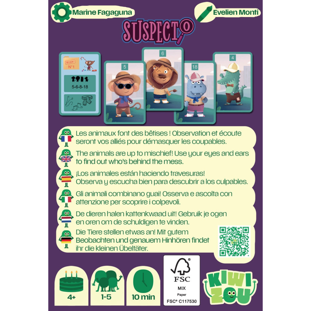Dans Suspecto, on choisit une enquête ainsi que les principaux suspects. Le début de chaque enquête fournit 3 indices visuels qui permettent d’innocenter l'un des suspects.Informations supplémentaires