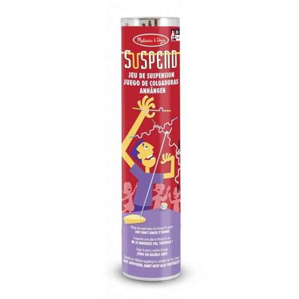À chaque tour, une nouvelle pièce est ajoutée à la sculpture verticale en constante transformation, ce qui provoque un ajustement de l’équilibre et hausse le niveau de difficulté. Suspend mettra vos nerfs à rude épreuve ! Il va falloir touver votre équilibre ! Tirez au sort à l’aide d’un dé la pièce à placer (une baguette métallique plus ou moins longue avec de une à cinq encoches pour s’accrocher). Reste alors à la placer sur le mobile constitué des pièces déjà suspendues mais sans les faire tomber ! Vous récupérez les pièces que vous faites choir : le premier qui n’a plus de baguettes à mettre ni dans sa réserve ni dans la réserve commune a gagné.