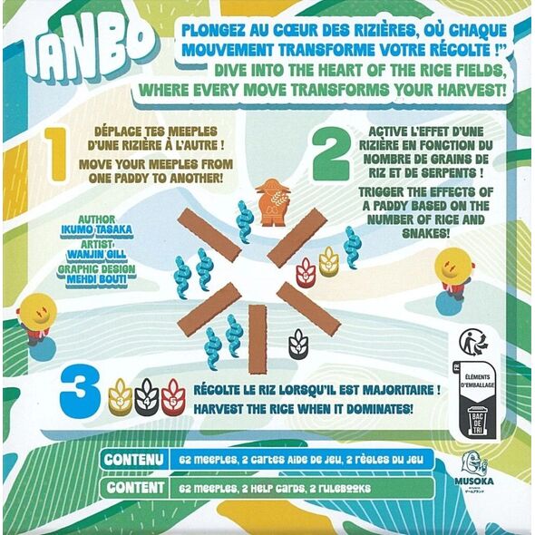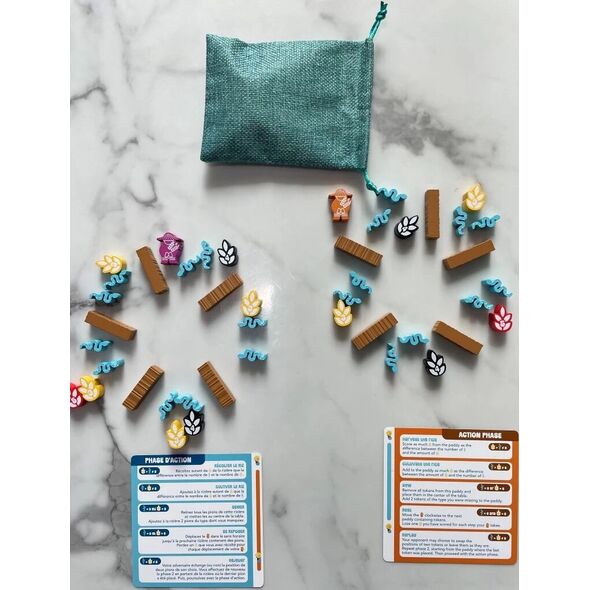 Plus il y aura de serpents, plus la récolte sera abondante. Cependant, il vous faudra limiter la présence de ces reptiles pour pouvoir récolter le riz. Déplacez vos meeples dans les rizières, activez les effets et récoltez le plus de riz possible !