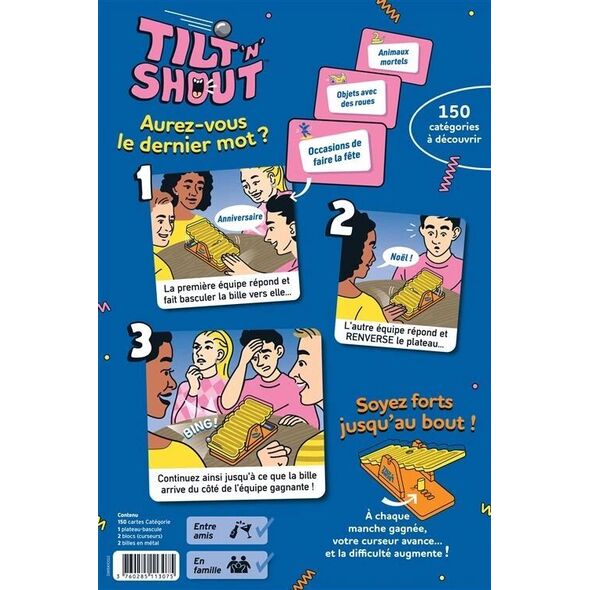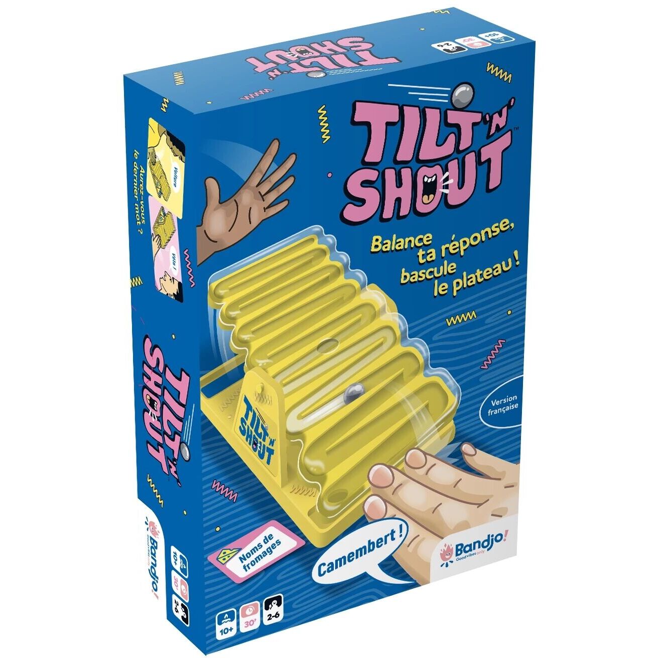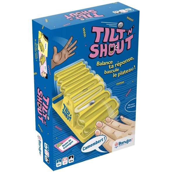 Tilt ‘n’Shout est un jeu effréné où deux équipes s’affrontent pour avoir le dernier mot. Choisissez une catégorie, répondez vite, puis penchez le plateau pour faire rouler la bille vers votre camp et gagner !