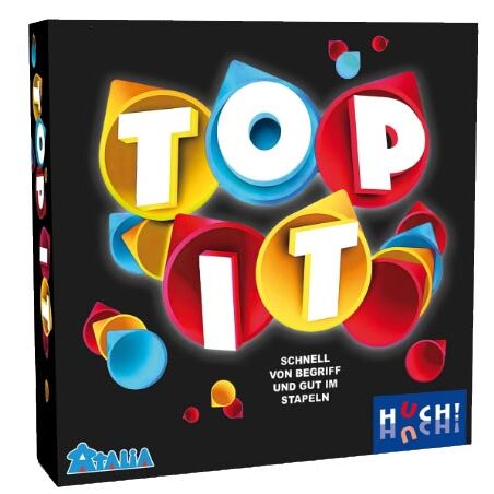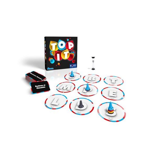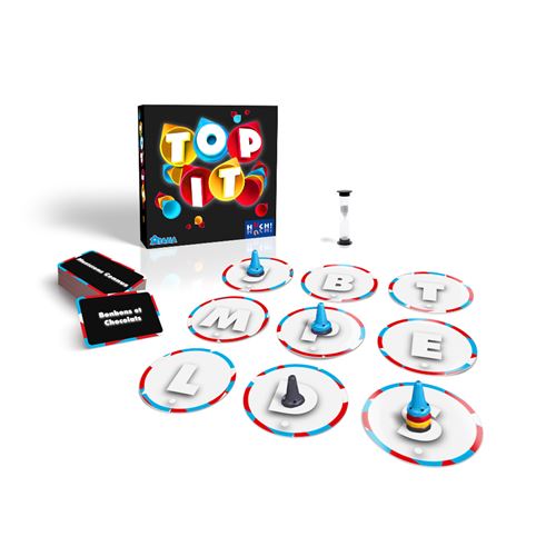 TOP IT est un jeu d'ambiance rapide où les joueurs s'affrontent simultanément pour poser leurs cônes sur une grille de jetons-lettres. L'objectif est de trouver le plus rapidement possible des mots correspondant à un thème donné et commençant par l'une des lettres visibles sur la grille.