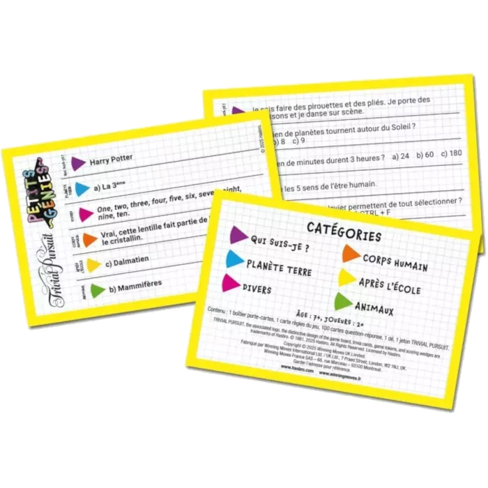 Grâce à ses 600 questions adaptées aux enfants, ce jeu stimule la mémoire, la réflexion et la soif d'apprendre ! Les question sont réparties en 6 catégories : Qui suis‑je ?, Corps humain, Planète Terre, Après l'école, Animaux et Divers.