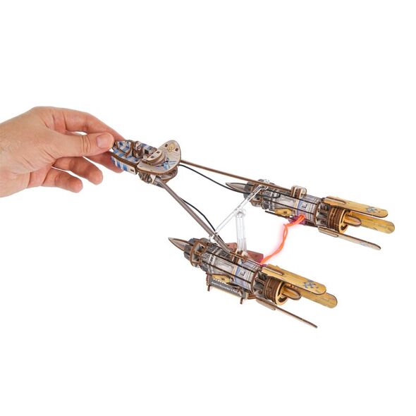 Le Podracer d'Anakin Skywalker d' Ugears capture l'excitation des courses de modules grâce à un mécanisme d'équilibrage unique qui permet au véhicule de s'incliner, de osciller et de tourner, simulant ainsi le vol stationnaire. Anakin Skywalker est assis dans le cockpit, dont la porte latérale s'ouvre manuellement. Les deux moteurs sont reliés par des câbles LED flexibles alimentés par batterie et créent l'arc électrique caractéristique du film. Pour activer la lumière, il suffit d'appuyer sur un interrupteur situé sous les moteurs, et l'arc électrique s'allume. Si la batterie est déchargée, pas de problème : le compartiment à batterie est facilement amovible et remplaçable.