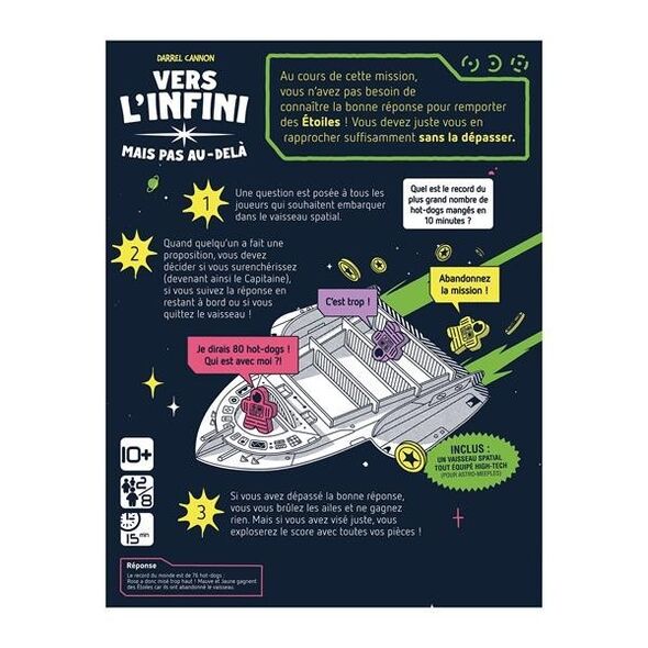 Chacun leur tour, les joueurs vont embarquer dans le vaisseau spatial en proposant une réponse à une question insolite: la réponse est forcément un nombre qu'il ne faut surtout pas dépasser! A tout moment, les joueurs les plus sceptiques peuvent finalement décider de descendre du vaisseau s'ils pensent que la réponse correcte est dépassée. Puis on regarde la bonne réponse et les joueurs récoltent ou non des points Étoiles en fonctions des enchères qui ont été faites.